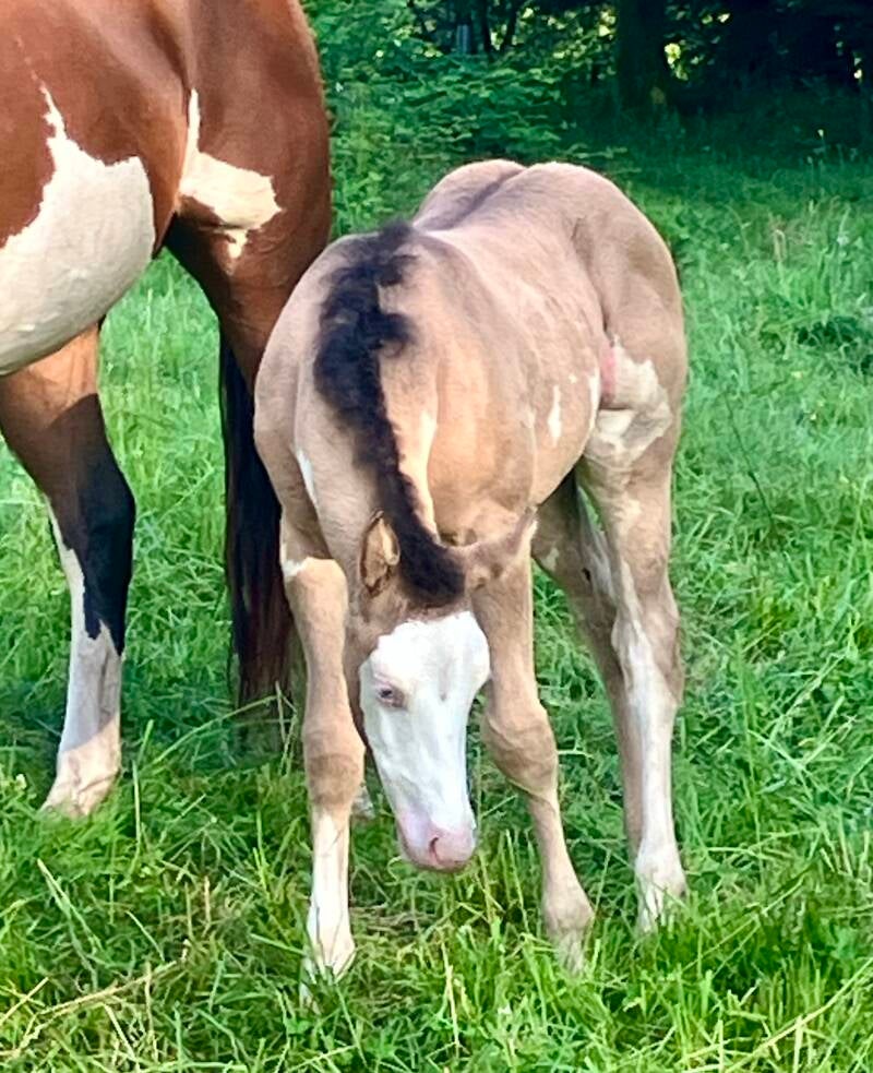 Femelle Paint horse PP ( 15 mars 2024) buckskin tobiano ( EE ou Ee Aa Cr/n To/n Dw20/n) , (possible Sw1 ou Lwo, à tester). Magnifique modèle osseux et de gros gabarit, douceur exceptionnelle, très grand coeur, lignée cow horse*all around. (Kid sugar Wood ( 1,56m)*Keep Cool Wolf King (1,54m))