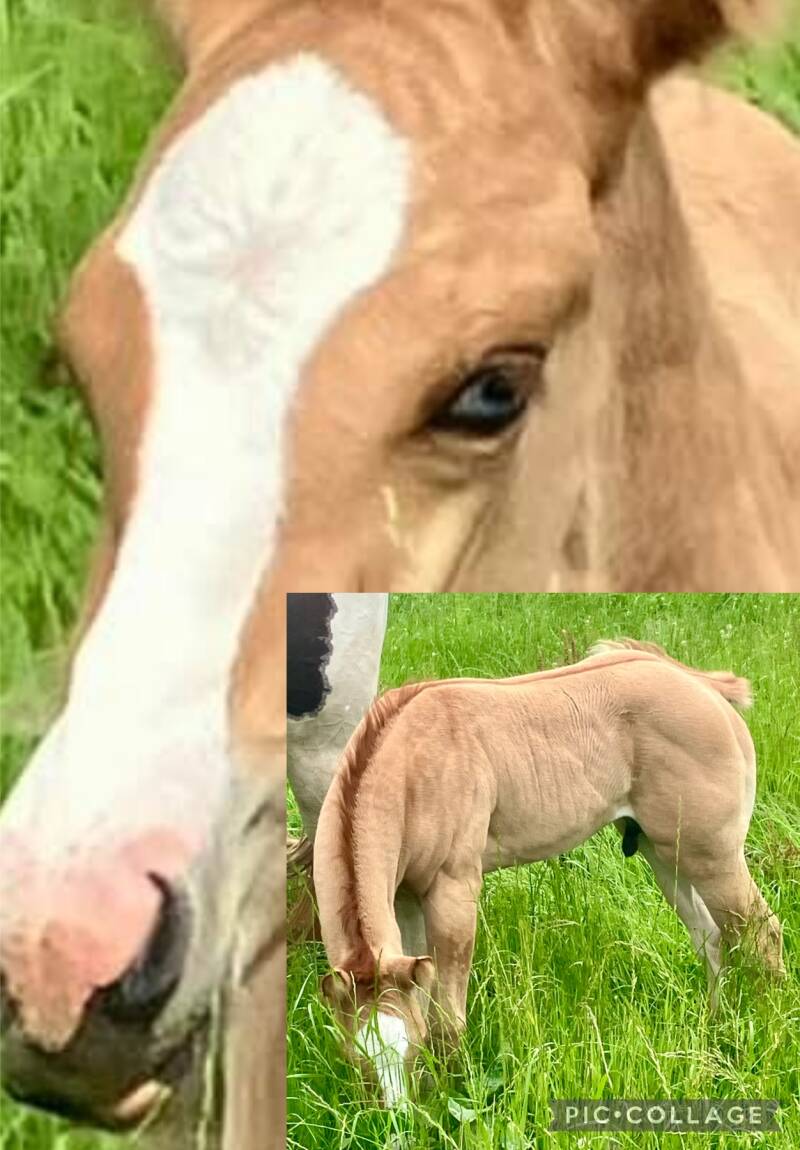 Très gros poulain dès sa naissance, red dun splash aux yeux d’un bleu électrique intense , une conformation parfaite.... sera un grand et gros modèle ( 1,58env), déjà de magnifiques allures !!