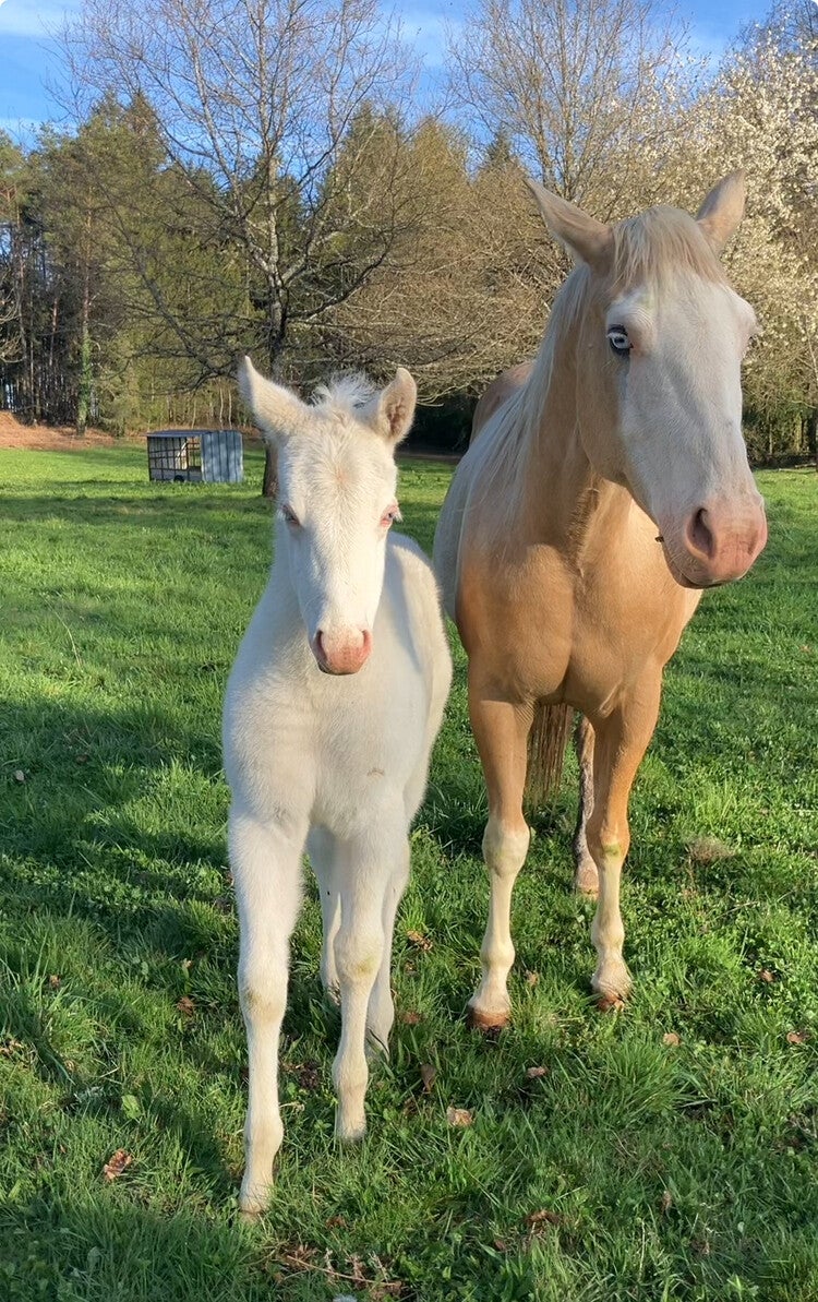 Magnifique pouliche APHA homozygote splash née le 09/04/2025 , très câline, curieuse, musclée avec une forte encolure et des épaules aussi larges que son popotin😍, le tout mis en valeur par sa raie de mulet! Elle sera une jument hors normes tant par son caractère que par sa morphologie, sa couleur et sa génétique !!!! ( EE AA SW1/SW1 DW20/n nd1/nd1 ou nd1/nd2 ; negative 6 panels, Gbed/n).